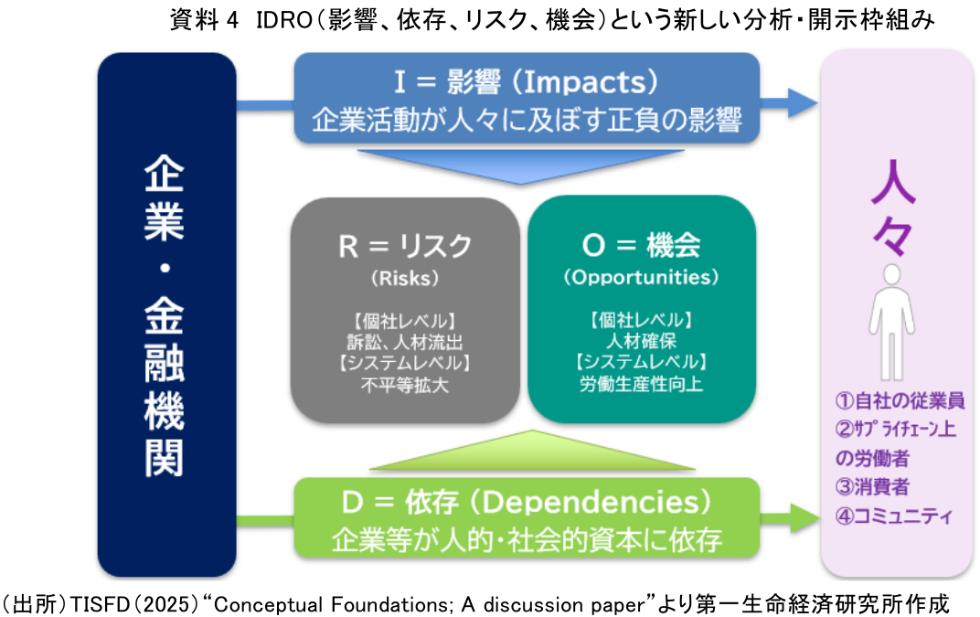 人々との関係性のなかで生まれる社会課題について、TISFDは企業等の活動が「どのような影響(Impacts)・依存(Dependencies)を持つか」を整理し、そこから生じるリスク(Risks)と機会(Opportunities)を分析・開示することを求める。この頭文字をとった「IDRO」が、今後の中核的な分析・開示枠組みとなると考えられる。