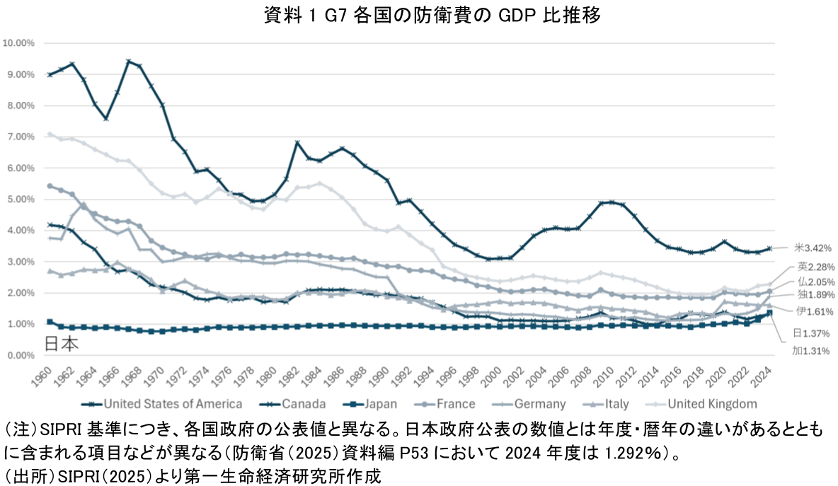 まず、日本の防衛費のGDP比水準の推移を振り返る。日本の防衛費は、長らく「GNP比1%枠」(GDP・GNPについては注2)のもとで運用されてきた。これは、諸外国と比して明らかに低い水準で、「日本は軍事大国にはならない」という意思を内外に示すための象徴であったいえよう。経済的にも「平和の配当」を享受することにも繋がった。G7の防衛費のGDP比推移は資料1の通りである。