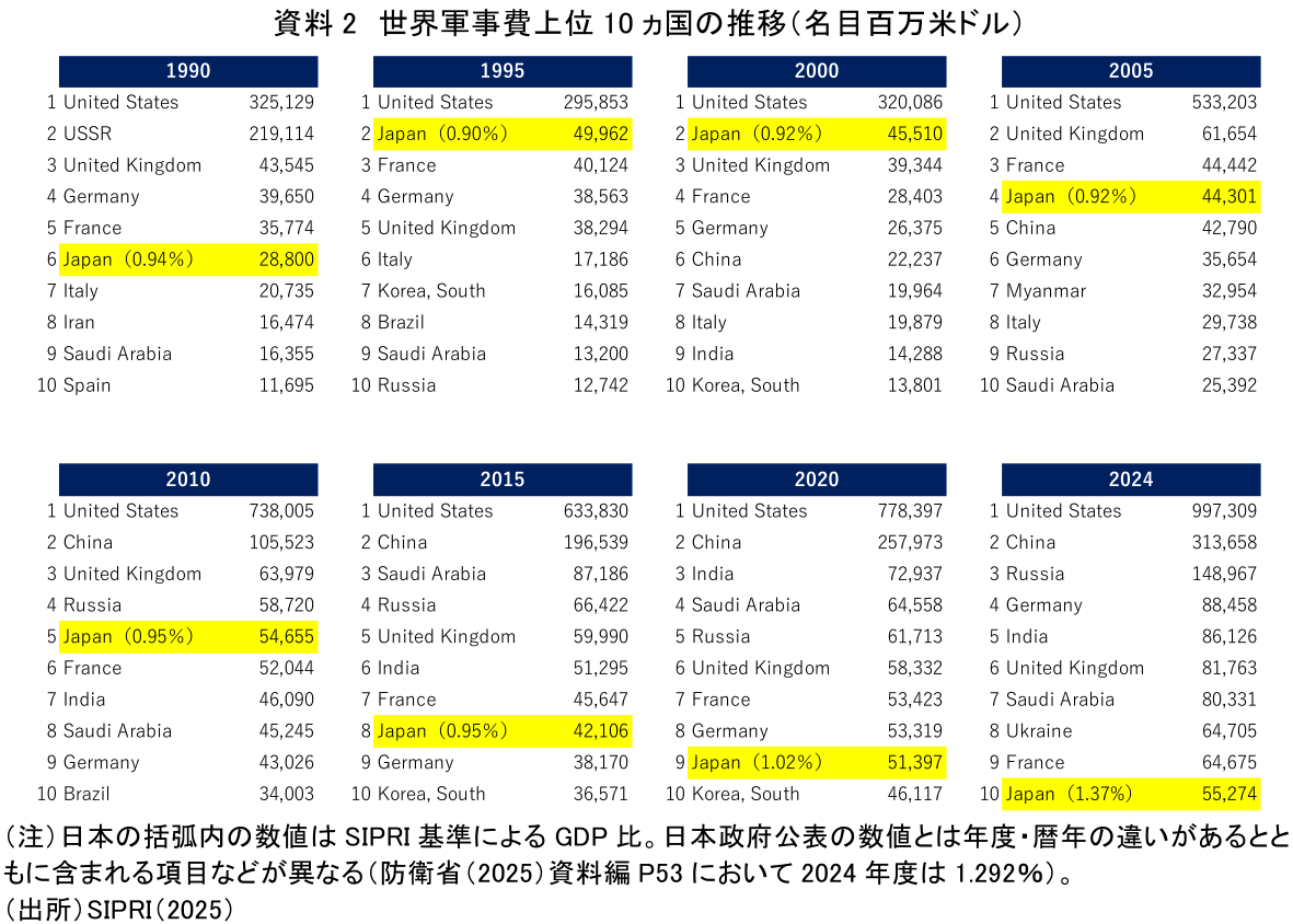 この時期、日本は「世界第2位の経済大国」であり続けていたため、1%前後という比率でも、防衛費の絶対額は大きかった。その意味で、他国との相対感としても「極端に低い」わけではなかったと言える。日本は1960年代末には世界第2位の経済大国となっている。その結果、GNP比1%という枠を概ね守りつつも、防衛費の絶対額は世界でも上位に位置するようになる。特に1990年代から2000年代前半にかけて、日本は世界で2位に位置していた(資料2)。