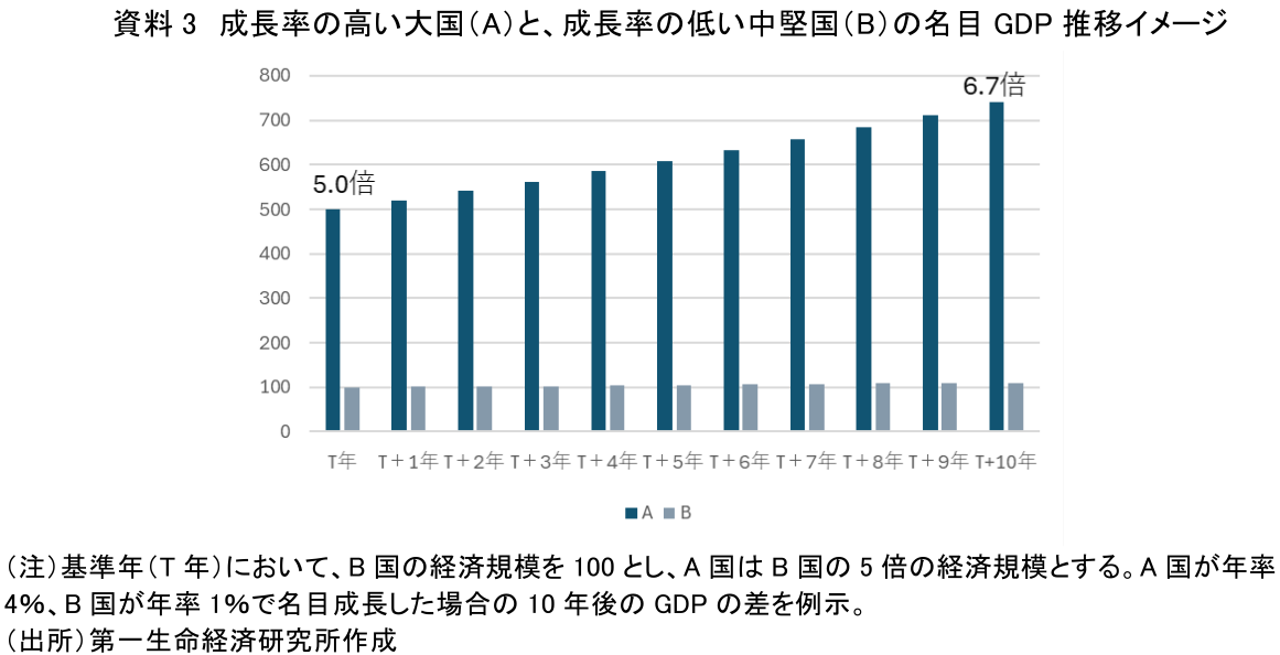 防衛費をGDP比で語るということと表裏一体のファクトとして、分子(防衛費)の絶対額の多寡は、分母(経済規模)の大きさがものを言うということがある。日本の経済成長が低位にとどまるのであれば、防衛費のGDP比を何パーセントに引き上げようとも、その絶対額は長期的には頭打ちになることになる。そして、他国が高い成長を続ければ、絶対額の差はさらに拡大する(イメージ図:資料3)。