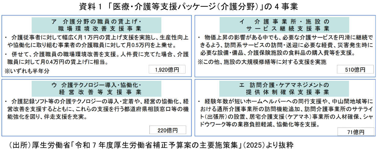2025年11月21日、高市内閣は「『強い経済』を実現する総合経済対策(以下「総合経済対策」)」を閣議決定した(注1)。同月28日には裏付けとなる2025年度補正予算案を閣議決定した。この中で、介護分野の賃上げ・経営支援等に補正予算2721億円を措置する「医療・介護等支援パッケージ(介護分野)」が示された(資料1)(注2)。高市首相は所信表明演説で「介護報酬に賃上げ・物価高を適切に反映」、「報酬改定時期を待たずに補助金を措置」と説明していたが(注3)、実現に向けて動きだしたことになる。