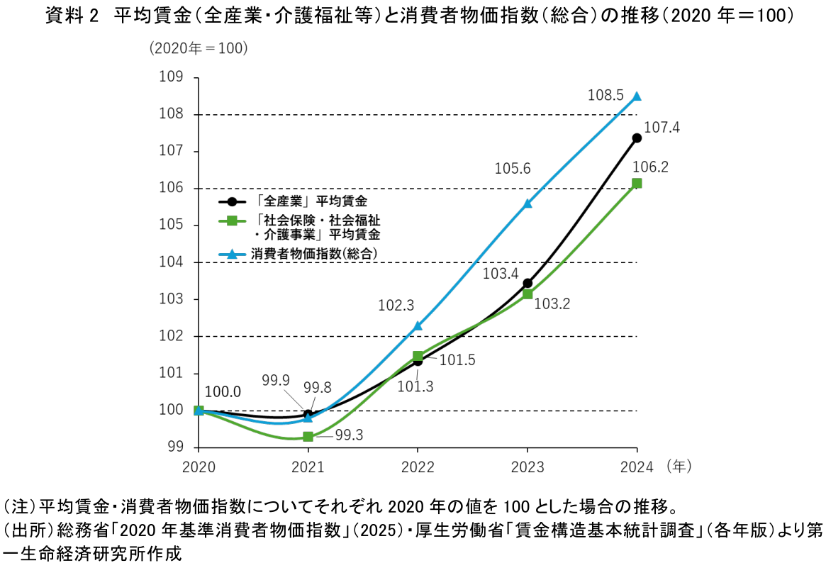 介護事業者の介護保険からの報酬(収入)は原則3年度ごとに改定される公定価格に基づく。価格転嫁が難しく収入は固定的だ。そのため、職員の賃上げ原資には限りがある。また、短期的な物価上昇は経営を逼迫させることになる(資料2)。次回の定期改定である2027年度を待たない適切な補助金措置は、介護職員・事業者にとって環境改善の一助となる可能性がある。