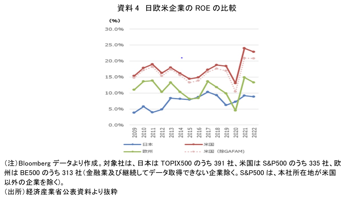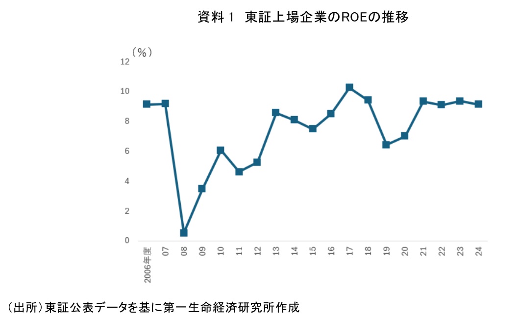 日本企業の収益性・資本効率の低さが課題視されて久しい。2014年8月に公表された、伊藤邦雄氏が座長を務めた経済産業省の「『持続的成長への競争力とインセンティブ~企業と投資家の望ましい関係構築~』プロジェクト」の最終報告書(「伊藤レポート」)で、特に日本企業のROEの低さが取り上げられ、最低でも8%を超えるROEを達成することが求められた。これを契機に、コーポレートガバナンス改革、東証による資本コストや株価を意識した経営の実現に向けた対応への要請といった、ROEの向上を目指した施策が採られてきた。