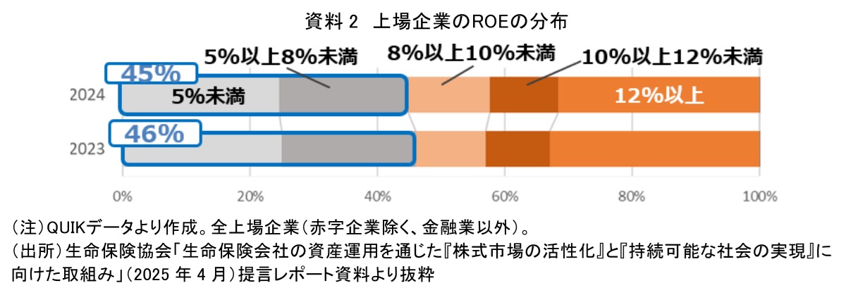 ここからは、東証上場企業全体ではリーマンショック後、ROE水準は上昇基調で、2016年度以降ではコロナ禍という一時的ショックがあった年度以外では、8%水準を超え、足元では9%超程度の水準となっていることがわかる。全体としては伊藤レポートの求める水準をクリアしていることにはなる。しかし、上場企業全体について個別にみると、まだROE8%に達していない企業も半数近くある状況である(資料2)。