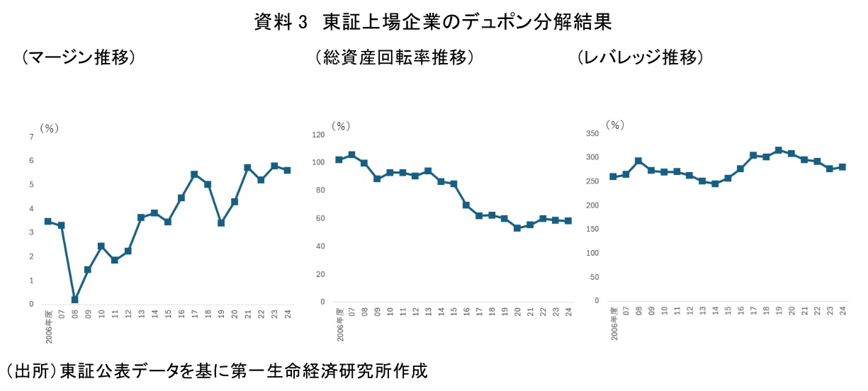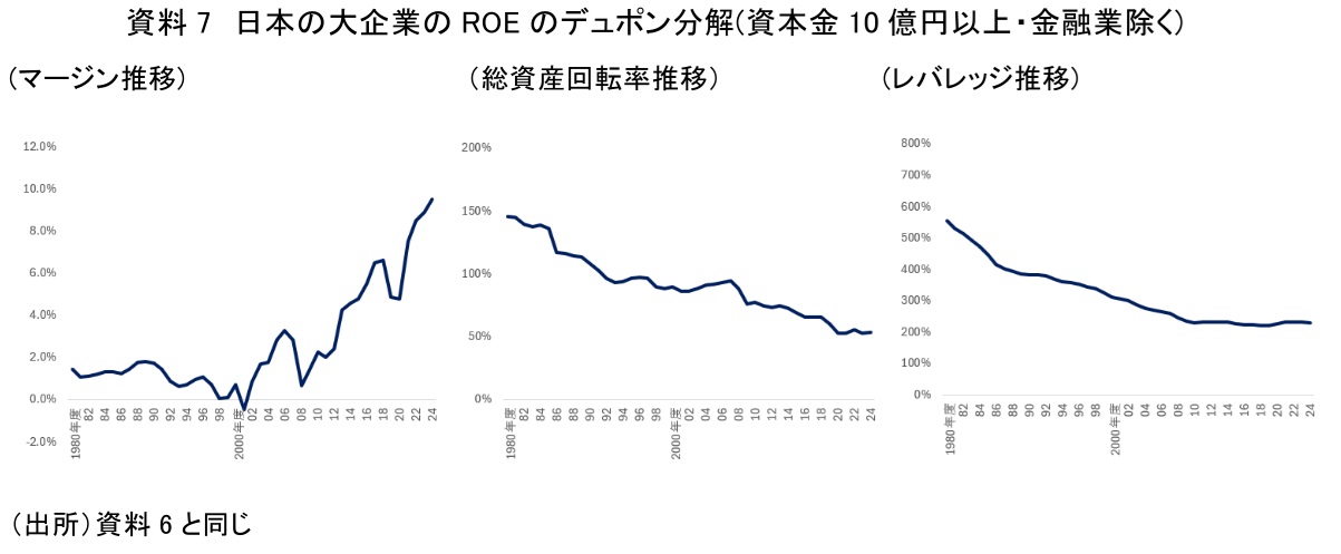 まず足元のROEの動きをデュポン分解で確認すると、リーマンショック後のROE改善は主にマージンの上昇によるが、2020年代以降は頭打ちとなり、総資産回転率は低下傾向にある。レバレッジの変化はあまりない。今後のROE向上に向けては収益性強化と資産効率の改善の双方が求められる状況といえる。