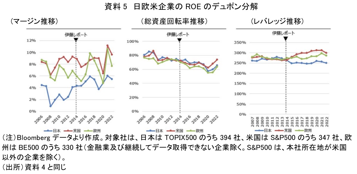 欧米企業との比較では、日本企業は総資産回転率・レバレッジで大差がない一方、マージンの低さが際立つ。