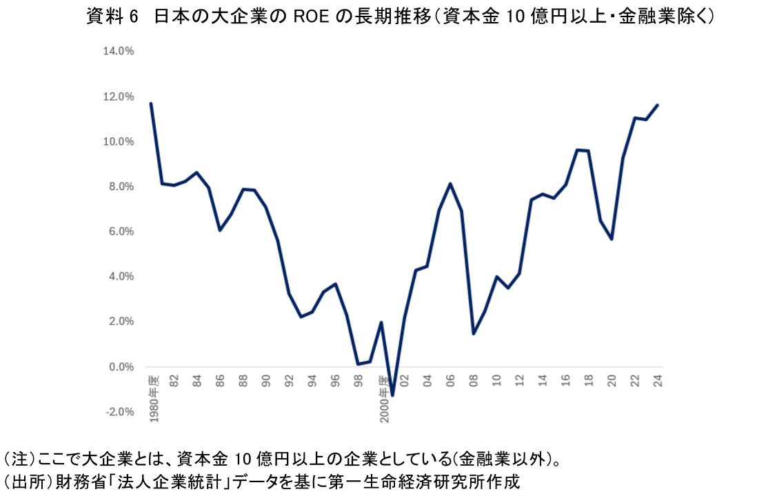 日本の大企業のROEはバブル前には8%を超える水準で、比較的高かったといえる。しかしバブル崩壊に伴い、ROEは急速に落ち込み、金融不況が続いていた2001年度にはマイナスとなった。その後急速に上昇したものの、リーマンショック時に再度大きく下落した。以後、コロナ時期に落ち込んだものの上昇基調で、2024年の水準は1980年と同水準であり、我が国の企業としてはかなり高い水準となっていると捉えられる。