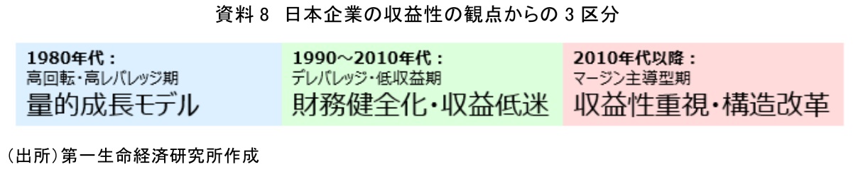 長期データの分析からは、1980年代の日本企業は高いROEを示していたものの、それは高い資産回転率とレバレッジに支えられており、マージン自体は一貫して低かったことが確認される。大量生産・大量販売に基づく成長モデルはバブル崩壊で崩れ、デレバレッジと国内市場縮小の中で収益構造が弱体化した。
