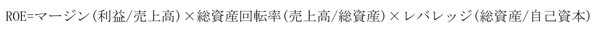 デュポン分解とは、次のとおり、ROEをマージン、総資産回転率、レバレッジの3つの財務の要素に分解すること。