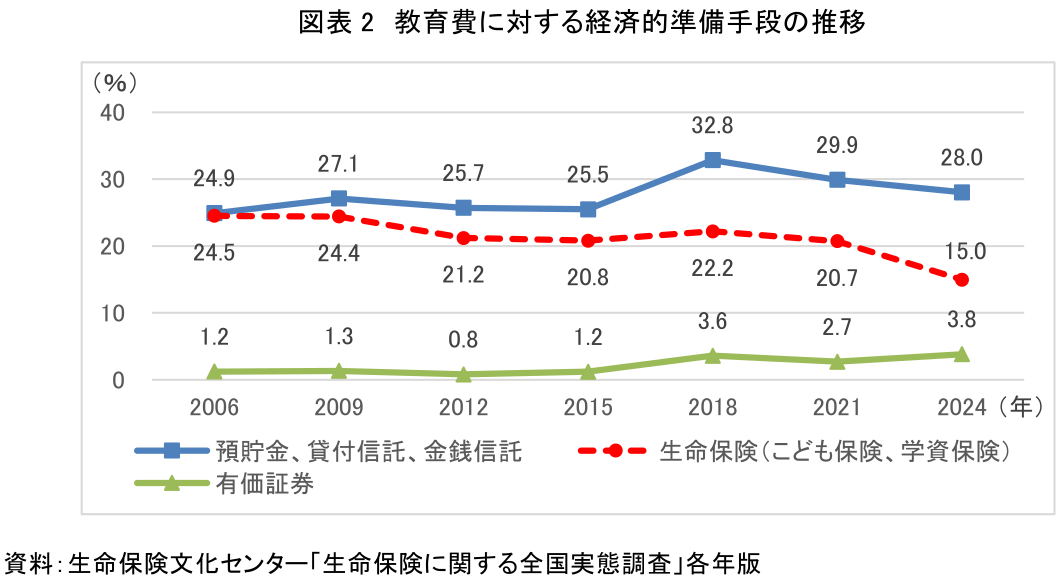 1つは、預貯金や学資保険を補完する役割である。これまで教育費の準備には、学資保険が活用されてきた。しかし、長期にわたる低金利の影響で、学資保険の返戻率は低下し、以前と比べて魅力が薄れてきている。実際に、教育費を預貯金で準備している人の割合は、2006年と概ね同水準であるが、学資保険などの保険で準備している人の割合は低下傾向にある(図表2)。