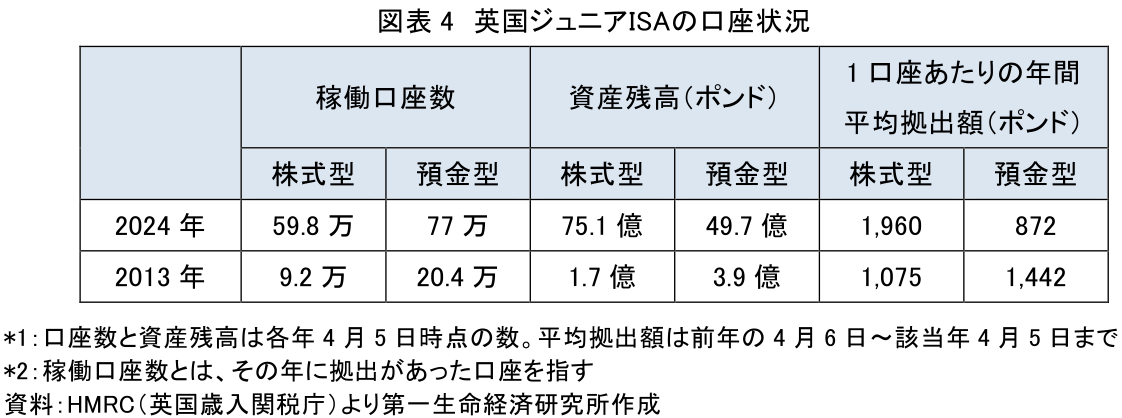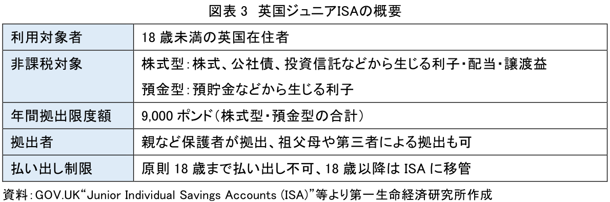日本のNISA制度は英国のISAがモデルとなっている。ISAは1999年に導入され、2011年11月には18歳未満の子どもを対象とするジュニアISAが開始された。ジュニアISAは、2005年4月に導入されたチャイルド・トラスト・ファンド(CTF)の後継制度として導入されたものである。CTFは、2002年9月1日~2011年1月2日に生まれた子どもが対象の税制優遇貯蓄スキームであり、口座で保有する金融商品から生じる利子や配当金等が非課税になるほか、誕生時と7歳時に国から補助金(250ポンド)が口座に支給された。CTFは財政上の理由から2011年に廃止され、代わりにジュニアISAが導入された。