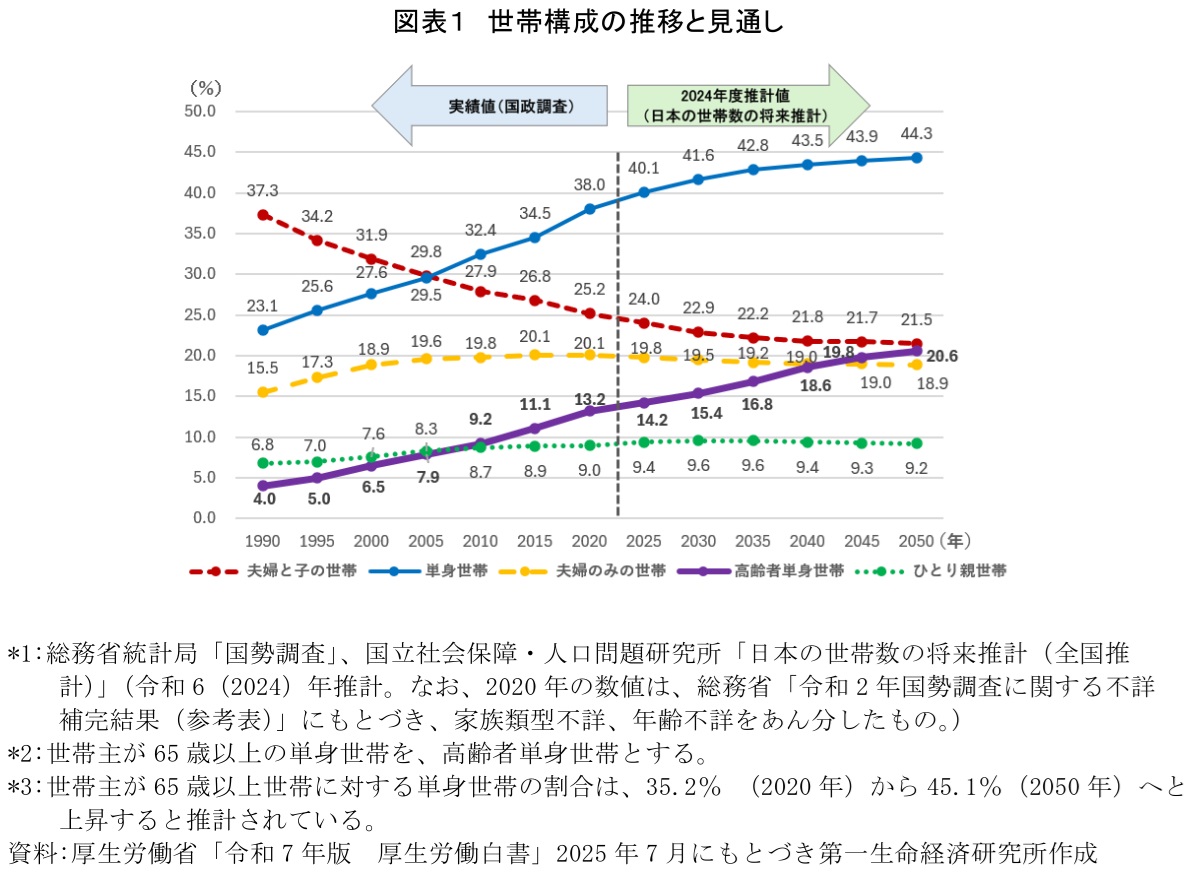 日本は今、高齢社会における新たな局面を迎えている。国立社会保障・人口問題研究所の推計によれば、図表1が示すように、昭和・平成の時代に多くの割合を占めていた「夫婦と子」の同居世帯といった世帯構成は縮小の一途をたどっている。代わって伸展しているのが単身世帯であり、右肩上がりの推移は、日本社会において「家族による支え合い」の基盤が物理的に縮小していることを客観的な数値として提示している。