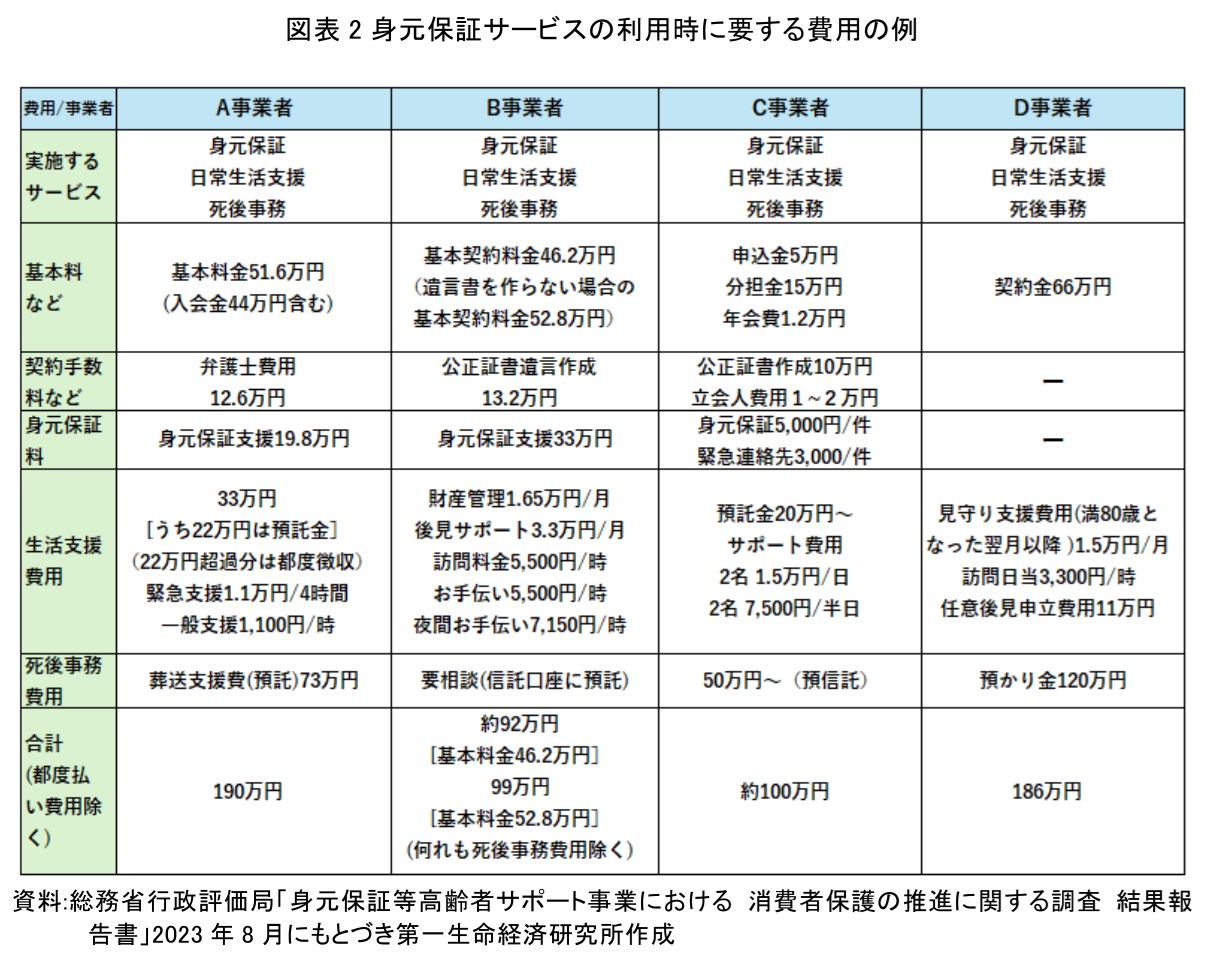 こうした家族機能の弱体化による「保証人空白」を埋めるべく、急速に拡大したのが民間の身元保証ビジネスである。これらの事業者は、身元保証のみならず、日常生活支援、死後事務(葬儀・納骨)、遺言執行までをパッケージ化し、「家族代行」としてサービスを提供している。しかし、これらのサービスを利用するには、数十万円から数百万円に及ぶ高額な契約金や預託金が必要となるケースが一般的であり、経済的に余裕のある高齢者しか利用できないという側面がある。図表2は、実際に事業者が提示している費用構造の一例を示したものである。入会金や契約金といった初期費用に加え、将来の弁済や死後事務に充てるための「預託金」を含めると、契約時点でまとまった資金が必要となることが読み取れる。この金額規模は、限られた年金のみで生活する多くの単身高齢者にとって利用しにくい。