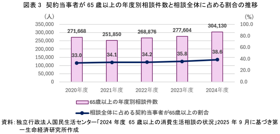 図表3に示す推移は、この「トラブル急増」の現実を客観的な数値として裏付けている。相談件数の規模と、相談全体に占める高齢者の割合の高さは、高齢化に伴うニーズの高まりが、そのまま消費者被害のリスク拡大に直結してしまっている厳しい実態を可視化しているといえよう。