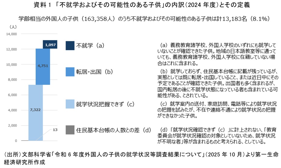 文部科学省(2025)では、義務教育諸学校もしくは外国人学校のいずれにも在籍していない「不就学」に加えて、「就学状況把握できず」と報告された子供、また「住民基本台帳の人数の差異」についても不就学の可能性があると考えられるとしている。さらに「転居・出国(予定含む)」についても、出国者も多く含まれるが、国内転居の後に不就学状態になっている子供が含まれている可能性があるとしている。したがって、本レポートでは、これらを「不就学およびその可能性のある子供」と定義し、資料1についてもこの定義に基づき作成している。