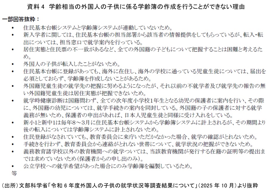 資料4は、資料3(下段)の、学齢相当の外国人の子供に係る学齢簿の作成状況に関する質問に対して、「義務教育諸学校に通う子供等一部の外国人の子供について行っている」、または「行っていない」と回答した計210の教育委員会が、できない理由について述べた回答(一部抜粋)である。ここで挙げられている理由のうち、標準仕様の学齢簿システムを導入することで解決できる課題をまず確認したのち、より構造的な課題の考察に進むこととする。