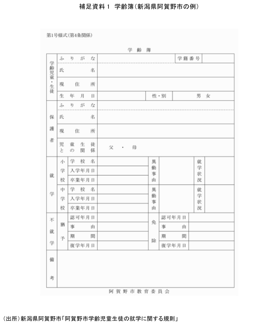 そもそも「学齢簿」とは何か確認したい。学齢簿とは、市町村教育委員会が住民基本台帳をもとに編製することを義務付けられている、学齢期の子供の氏名、住所、生年月日、保護者情報、就学先等を記録した基礎台帳である(注1、注3)。誰がどのような内容の学齢簿を編製するかは、法令により明確に定められている。