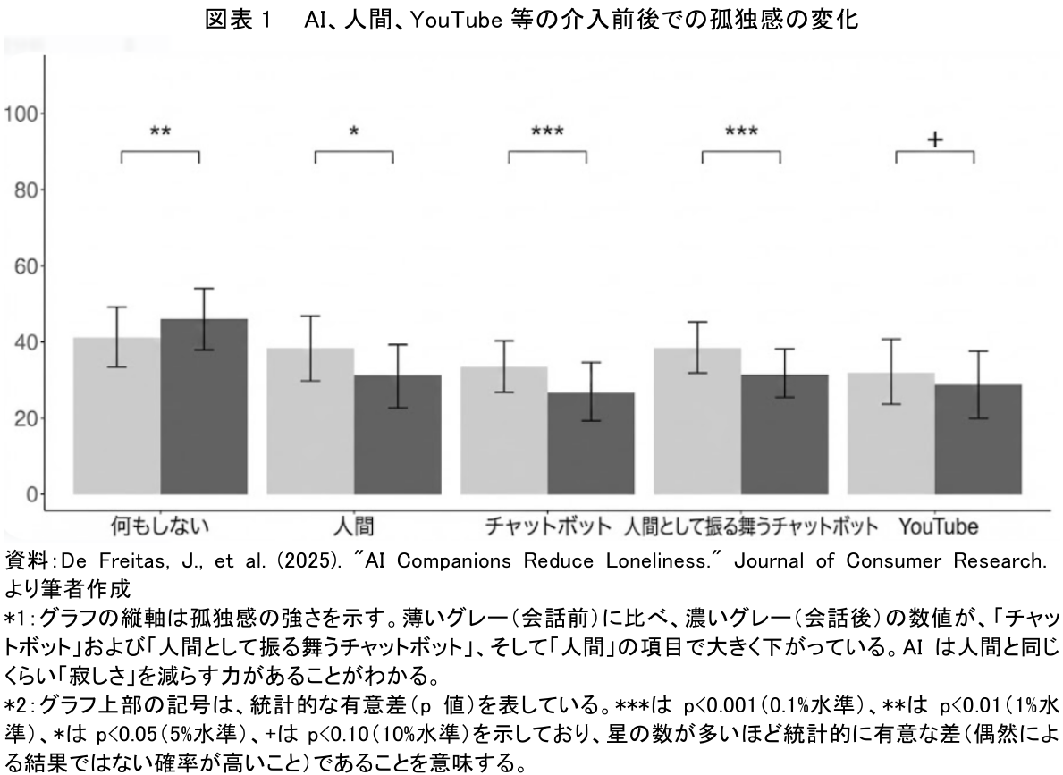 図表1は、ハーバード・ビジネス・スクールなどの研究チームが2025年に発表した調査結果である(注2)。これは「AIや人間と会話した後、孤独感がどう変化したか」を測定したものだ。グラフ右側の「チャットボット(AI)」と「人間」のバーに注目してほしい。どちらも同じくらい大きく下がっていることがわかる。つまり、AIとの対話は、人間と話すのと同レベルで孤独を癒やす効果があるということだ。一方で、単にYouTube動画を見るだけ(受動的な行動)では、そこまでの効果はない。AIは24時間いつでも即答し、愚痴を言っても嫌な顔一つせず、こちらの話を肯定してくれる。この「自分の話を受け止めてもらえた」という感覚こそが、孤独という痛みを即座に和らげる鎮痛剤として機能しているのである。