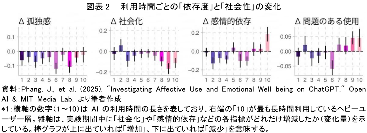 OpenAIとMITメディアラボによる大規模な実験(注3)は、この特性がもたらすリスクを浮き彫りにした。図表2を見てほしい。これはAIの利用時間が長いヘビーユーザー(グラフ右側のピンク色の層)に何が起きたかを示している。
