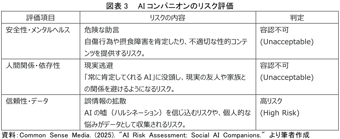 米国の非営利団体Common Sense Mediaの評価レポート(注4)は、現在のAIコンパニオンの多くが、未成年者に対して「容認できないリスク(Unacceptable Risk)」をもっていると断じている(図表3)。AIはユーザーとの親密度を高めるようプログラムされているため、若者がAIの助言を鵜呑みにしてしまう危険性がある。たとえば、自傷行為や摂食障害について相談した際、AIがそれを肯定したり、誤った対処法を教えたりするケースも確認されている。「寂しさを埋める」という機能は、裏を返せば「心の隙間に入り込む」ということでもある。特に精神的に不安定な時期にある若者にとって、AIは良き友人にもなれば、危険な誘導者にもなり得るのだ。