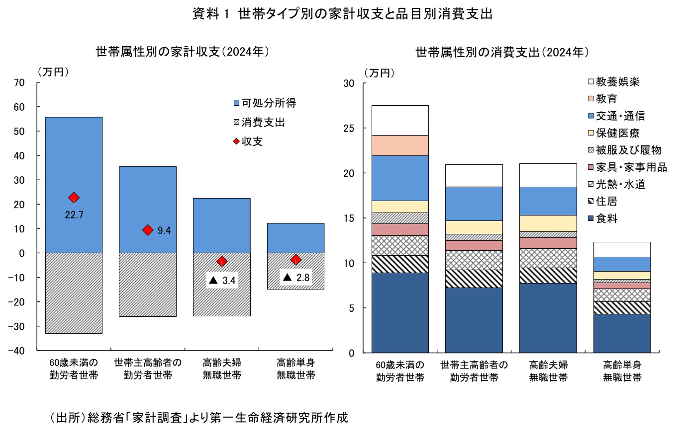 高齢者が経済全体において存在感を増す中で、高齢者家計の消費活性化はマクロ経済の課題であると同時に、高齢者自身のウェルビーイング(Well-Being)の観点からも重要性を増している。高齢者の暮らしぶりについて総務省「家計調査」から2024年の家計収支をみると、60歳未満の勤労者世帯では平均22.7万円/月の黒字となっている。高齢者世帯(65歳以上の者のみで構成される世帯)の勤労者世帯では黒字額が9.4万円/月となるが、退職すると収支が赤字となる(資料1)。高齢夫婦無職世帯では▲3.4万円/月の赤字、高齢単身無職世帯では▲2.8万円/月の赤字である。いわゆるライフ・サイクル仮説が示すように、勤労期には貯蓄を進め、退職後には社会保障と蓄えの取り崩しによって生活する形となっていることがわかる。