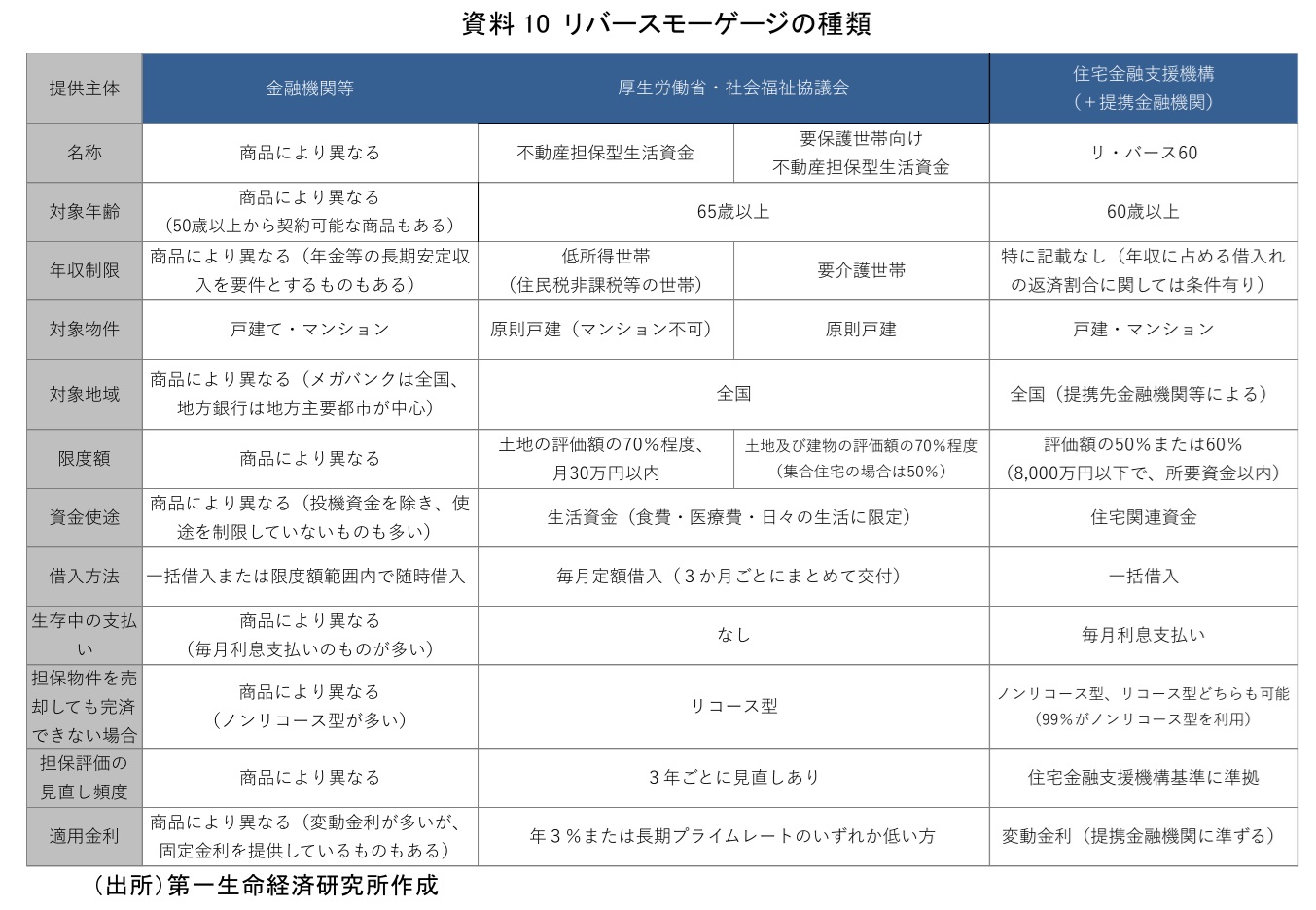 現在、日本で提供されているリバースモーゲージは、大きく分けて3つある。民間の金融機関等が提供するもの、厚生労働省が主管し、全国の社会福祉協議会が実施主体となる「不動産担保型生活資金」、そして、住宅金融支援機構が金融機関を通じて提供する「リ・バース60」である(資料10)。