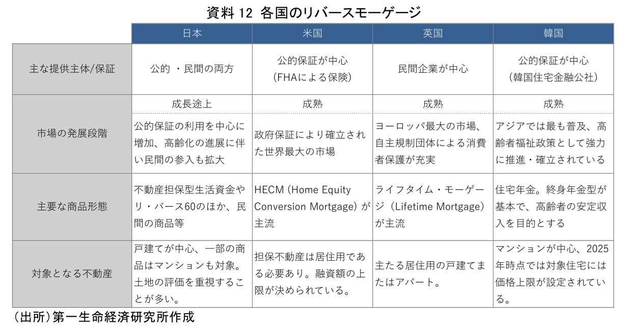 アジアで最もリバースモーゲージが普及しているのは韓国である。韓国では、年金制度での高齢者のカバー率が高くなく、彼らの収入を安定させる制度として、政府が韓国住宅金融公社を提供主体としたリバースモーゲージ制度「住宅年金」を発足させた。住宅年金は、利用対象は55歳以上、2024年時点では居住する住宅価格が12億ウォン以下であること、となっている。融資は基本的に終身年金で受け取り、融資期間中の元利返済はない。韓国では、高齢者世帯のほとんどが住宅を保有しており、その多くがマンションであるため、住宅年金もマンションを対象に普及している。 日本では、1981年に武蔵野市が開始した「福祉資金貸付事業」がリバースモーゲージの始まりである。これは、1年以上武蔵野市に居住する高齢者を対象に、戸建て・マンションを担保として、武蔵野市福祉公社の有償住宅サービス(ソーシャルワーカーと看護師の訪問、家事援助サービス、食事サービス等)の利用料を融資するものであった。その後、一部の自治体などが同様の制度を発足させたほか、民間金融機関等がリバースモーゲージに参入して広がりを見せたものの、リコース型の商品であったことから、バブル崩壊後の担保割れリスクなどにより、リバースモーゲージの普及は一時停滞することとなった。2000年代に入り、高齢化の進展と住居資産活用の必要性からリバースモーゲージが再注目され、2007年に住宅金融支援機構が「リ・バース60」の提供を開始、民間の参入も徐々に拡大しており、リバースモーゲージの普及が進んでいる最中である(資料12)。
