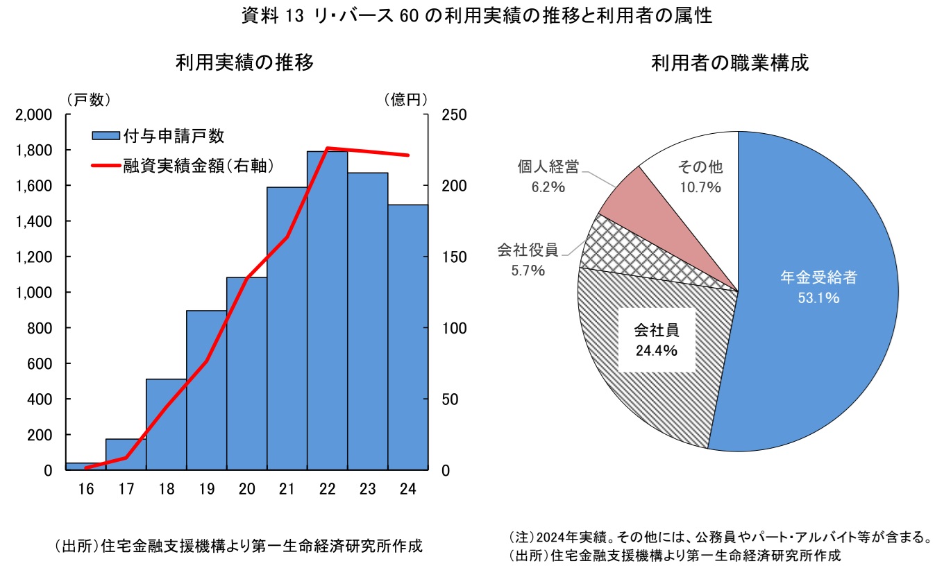 それでは、現在の日本では、どの程度リバースモーゲージが普及しているのだろうか。住宅金融支援機構の「リ・バース60」は四半期ごとに利用実績が公表されており、その推移や利用者の属性がある程度わかる(資料13)。利用実績の推移を確認すると、制度開始以降、申請戸数は増加してきたものの、22年の付保申請戸数1,790戸、融資実績額226億円をピークに、足もとでは幾分減少傾向にある。「リ・バース60」の資金用途が住宅関連に限定されていることを鑑みると、高齢者世帯の新築住宅のニーズ減少や、リフォーム需要の一巡、数十年ぶりのインフレ率の上昇で住宅関連全体への支出そのものが縮小した影響も考えられる。累計でみると、直近24年時点の利用実績は9,241戸となっている。リバースモーゲージの利用対象になると考えられる、住宅を所有している65歳以上の単身世帯、夫婦のみ世帯は、国立社会保障・人口問題研究所によれば、25年時点で約1,141万世帯であるため、「リ・バース60」の利用世帯は利用対象世帯のうち約0.08%程度ということになる。民間の金融機関等が提供している商品を含めて考えても、まだまだ普及が進んでいないといえるだろう。利用者の属性は制度開始以降、大きくは変化しておらず、平均年齢は69.5歳、平均年収は388.3万円、職業構成は年金受給者と会社員が約77%を占める。その他に、会社役員や個人経営者、公務員やパート・アルバイト等が利用している。