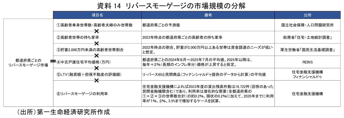 まず、都道府県ごとのリバースモーゲージの市場規模を以下の項目に分解して考える(資料14)。