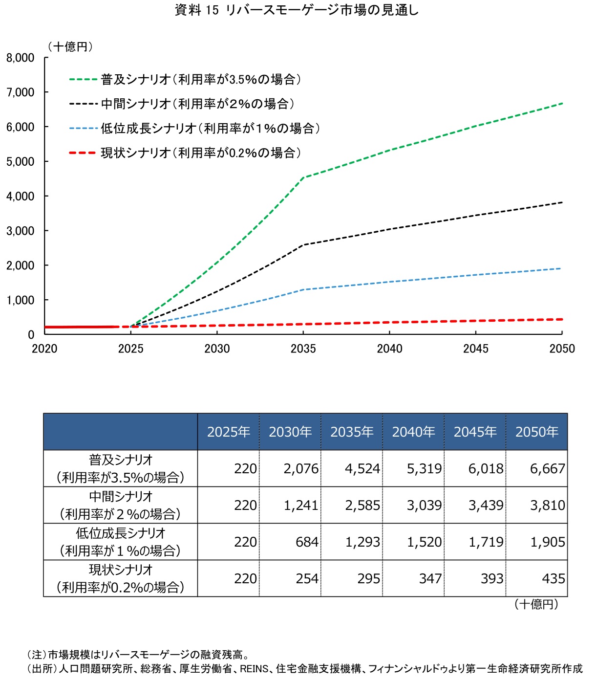 以上の項目の数値を掛け合わせ、都道府県ごとのリバースモーゲージの融資残高を算出し、足し合わせて日本のリバースモーゲージ市場の潜在的な市場規模を試算した(資料15)。試算によれば、2025年時点の融資残高は2,205億円、利用率が現状の0.2%で推移した場合、2035年には2,953億円、2050年には4,353億円まで緩やかに拡大する。これは、高齢者世帯の増加とインフレ率の上昇に伴う中古戸建住宅価格の上昇で、融資残高が増加していくからである。仮に、リバースモーゲージの利用が普及し、利用率が1%に増加した低位成長シナリオでは2050年に1兆9,049億円、利用率が2%に増加した中間シナリオでは3兆8,098億円、利用率が3.5%まで増加した普及シナリオでは6兆6,672億円まで、融資残高が膨らむ。