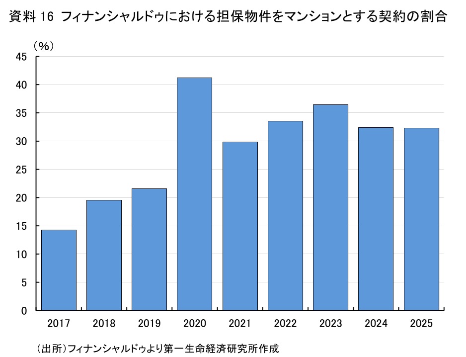 2024年度末時点での住宅ローンの融資残高は約227兆円であり、インフレ率を考慮すると2050年時点では約372兆円となる。普及シナリオでも、2050年時点で住宅ローン市場の1.8%程度の融資残高にとどまり、住宅ローンと比較して決して大きい市場とはいえない。ただ、高齢化や人口減少といった人口動態の変化や、インフレの定着などの経済環境の変化に伴い、潜在的なニーズが高まることで市場自体の拡大余地はあろう。特に、近年の不動産価格の上昇が続くもとで、インフレ(現預金の実質価値の目減り)が続けば、有効な資金調達方法としてリバースモーゲージの利用が進み、短期的にも市場が拡大する要素になりうる。また、取扱商品の拡充により、今後市場が拡大していく可能性もある。現状では、日本のリバースモーゲージ市場は戸建住宅を対象とした商品が多いが、マンションを担保物件とした契約も増加しつつある。資料16は、フィナンシャルドゥの契約に占める区分建物(マンション)を担保物件とした契約の割合である。フィナンシャルドゥではマンションを担保物件とした契約保証にも注力しており、リバースモーゲージ保証を開始した2017年から件数は増加し続け、足もとでは全体の約3割を占める。ただ、後述するように、マンションの場合は、契約に際して築年数や専有面積等の条件が課されることもあり、市場全体では十分に活用が進んでいるとは言い難い。今後、市場全体でマンションを担保物件としたリバースモーゲージの活用が広がれば、リバースモーゲージ全体の利用率も上昇していくと考えられる。リバースモーゲージの利用や認知拡大が進めば、高齢者の将来不安を和らげる効果が期待できるだろう。