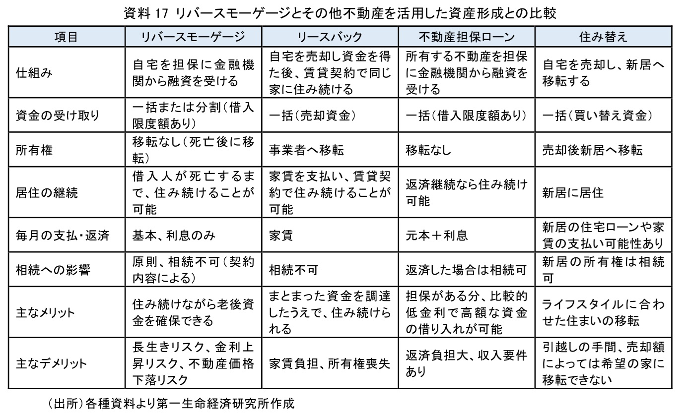 不動産を活用した老後の資産形成はリバースモーゲージだけではない。前章で述べたリースバックのほか、自宅など保有する不動産を担保に金融機関から融資を受ける不動産担保ローン、自宅を売却し、より低廉な住居に住み替える方法などがある。資料17は、それらの特徴を比較したものである。たとえば、自宅に住み続ける意向がそれほど強くなければ、住み替えという選択肢も考えられる。資金需要が一時的なものであれば、不動産担保ローンの活用も検討に値する。