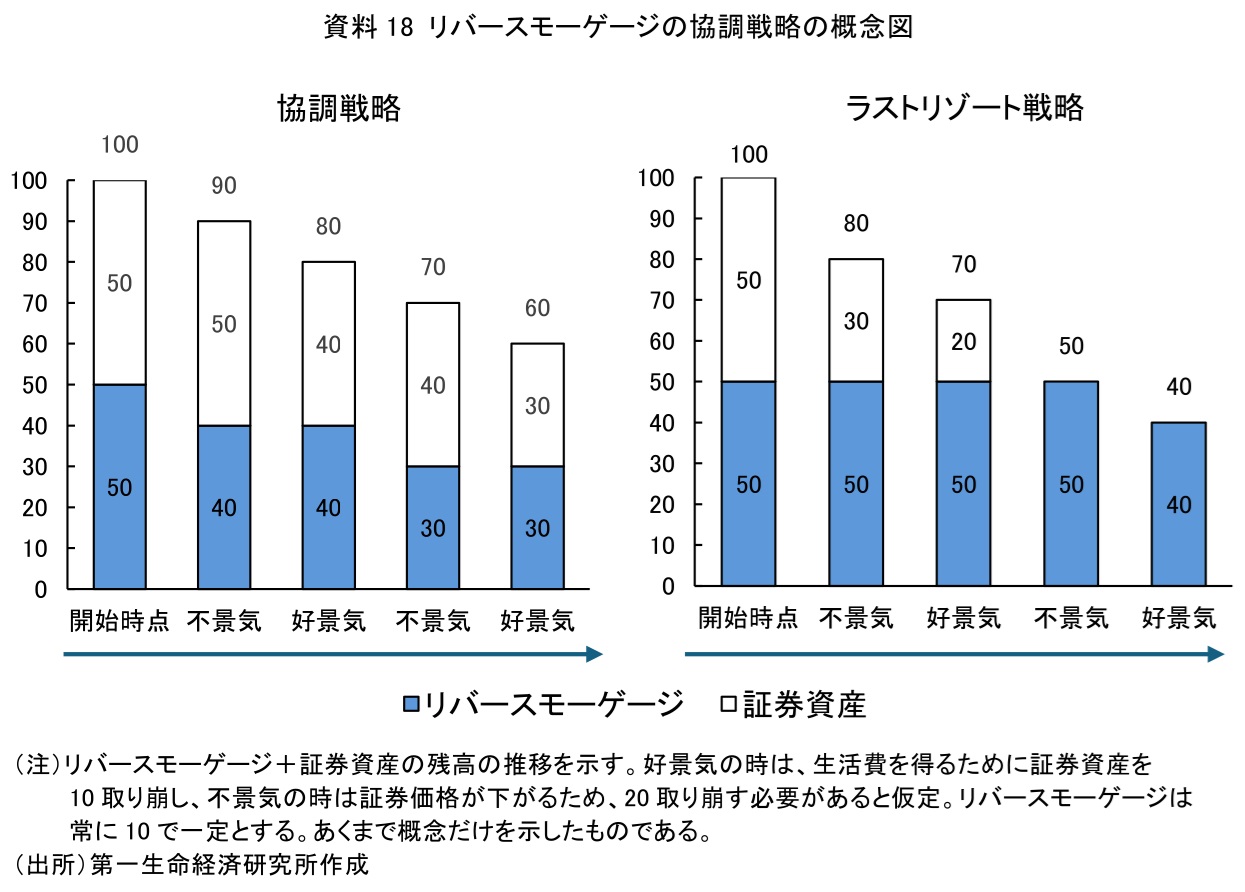 ただ、近年では老後資金のポートフォリオに組み込むことを推奨する向きもある。老後資金を証券資産で積み立てていた場合、資金が必要な時に市場が低迷していれば予想より少ない額となるなど、資産を取り崩す際の市場リスクがある。この点について、Walker et al. (2021)は、リバースモーゲージの活用により市場変動リスクを抑えられると指摘する。具体的には、証券投資の収益がプラスのときは証券を取り崩し、マイナスのときはリバースモーゲージを活用するという「協調戦略」をとった場合、ラストリゾートとして活用するよりも資金枯渇リスクが低下すると示している。同研究を概念的に示したものが資料18である。