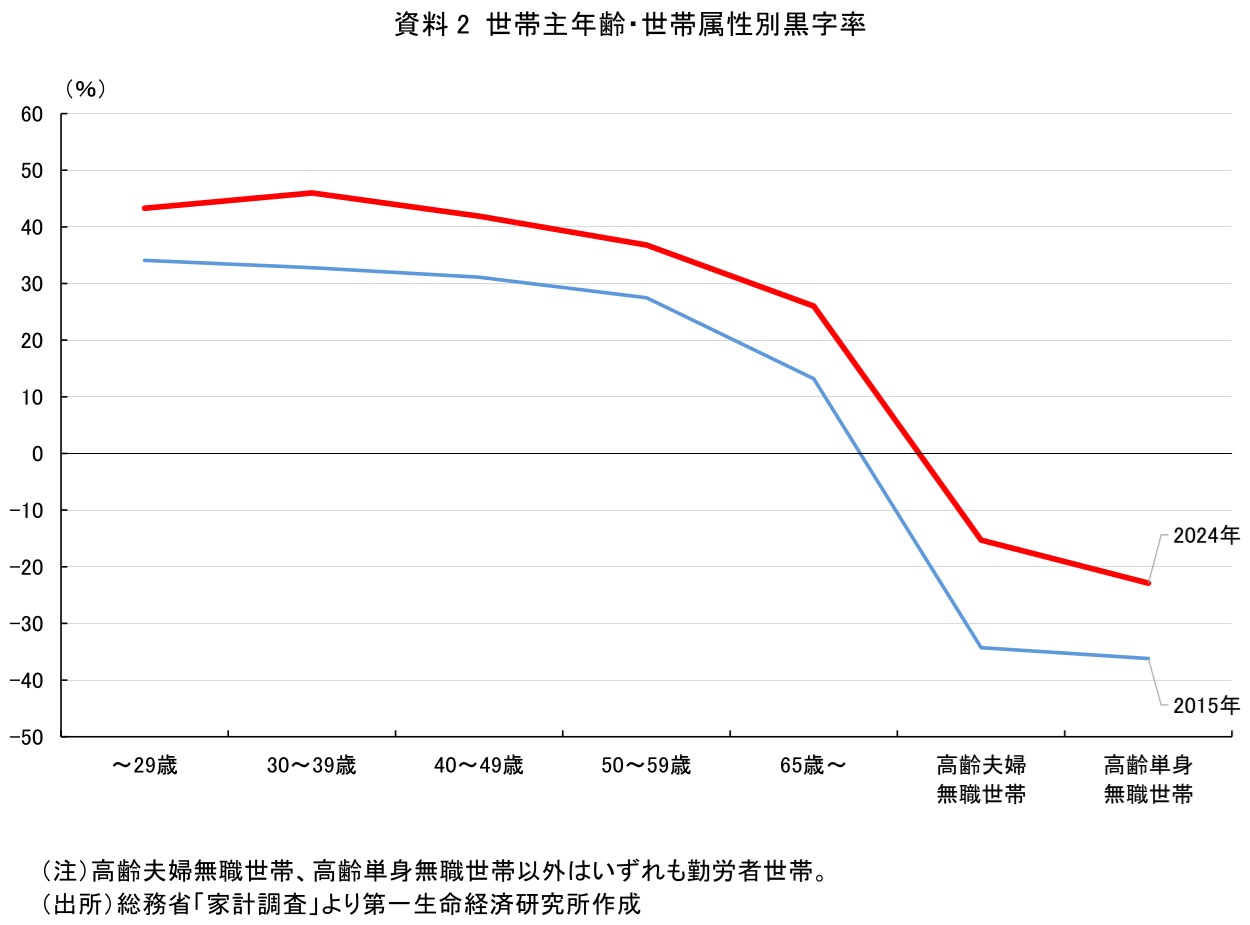 さらに、無職世帯における取り崩しの割合は過去と比べると縮小しており、家計が堅実化していることも読み取れる。資料2は総務省の家計調査における黒字率を2015年と2024年で対比している。黒字率は年齢階層に関わらず上昇しており、高齢者世帯についても例外ではない。現役世代は従来よりも老後の蓄えを拡大し、高齢者世帯は老後の取り崩しを小さく抑えるようになっている。