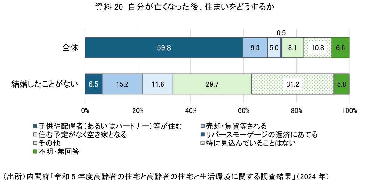 これらを踏まえると、現時点ではリバースモーゲージは日本の資産形成手段として十分に普及していないため、今後の動向は、認知度向上や利用拡大、さらに「貯蓄から投資へ」の進展状況に左右されるといえる。そもそも現状では、持ち家志向が根強い一方、購入した住宅を老後どうするのかという視点が乏しい面がある。内閣府の「高齢者の住宅と生活環境に関する調査結果」によると、「自分が亡くなった後、住まいをどうするか」という問いに対して、約6割が「子供や配偶者(あるいはパートナー)等が住む」と回答している(資料20)。一方で、結婚したことがない者に限ると、「特に見込んでいることはない」(31.2%)や「住む予定がなく空き家となる」(11.6%)との回答が相対的に高い。この結果からは、「子供や配偶者が住む」と回答した人の中にも、実際には自分の死後に、自宅の処分に具体的な見通しがなく、「とりあえず家族に任せる」という意識が含まれている可能性がうかがえる。リバースモーゲージの普及には、まずは「将来的に家をどうしたいのか/どうするべきか」を意識し、限られた条件下でのベストなあり方の検討が必要であろう。