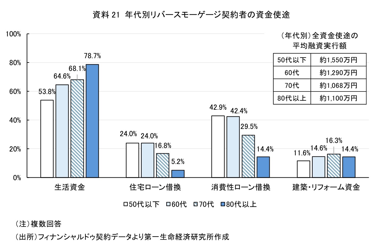 実際にリバースモーゲージの利用においては、資産価値の高い不動産を保有しているが、日々の生活資金には余裕がない「ハウスリッチ・キャッシュプア」の高齢者に特にメリットがある。フィナンシャルドゥのデータによると、リバースモーゲージ契約者の資金使途は生活資金が多く(資料21)、使途が生活資金のみである契約者の融資実行額は平均で約780万円にのぼる。Ⅱ章で述べたとおり、リバースモーゲージの変動金利は3%前後を適用している商品が多い。仮に変動金利が年3.35%時に一括で借りた場合、月々の支払は約2万2,193円である。また、必要な時に必要な分を借りるプランであれば、借入金額に応じた利息のみ負担する。たとえば、自宅のバリアフリー化や老朽化対策のために300万円借りるケースでは、月々約8,535円の支払いとなる。このように、金利の負担のみで大きな資金の借入が可能なことが、リバースモーゲージの特徴である。