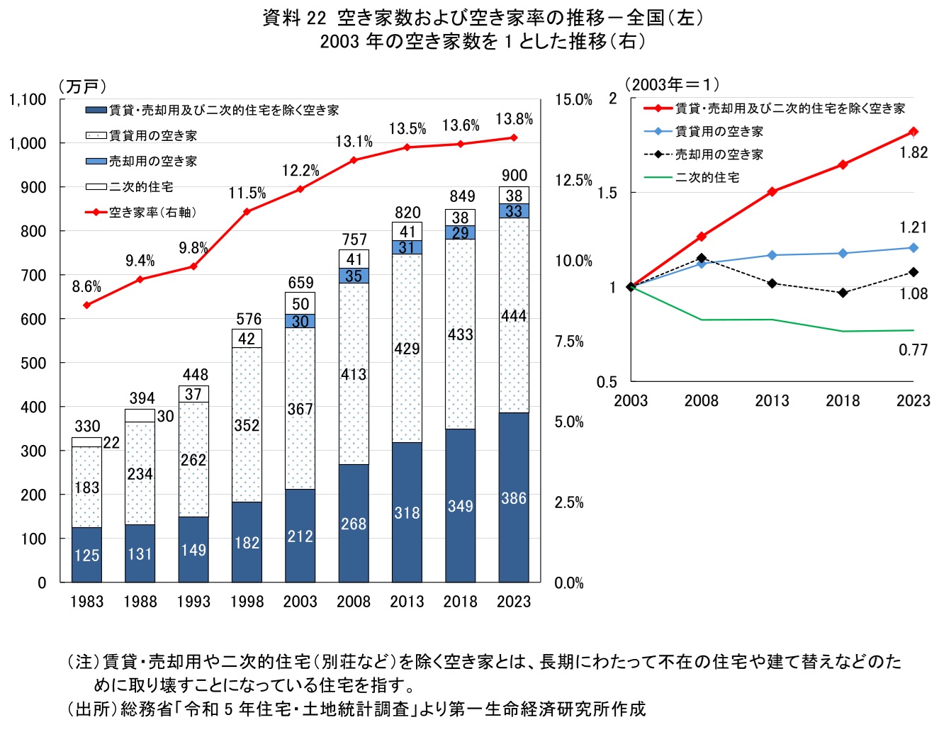 さらに、リバースモーゲージは、空き家問題にも寄与すると考えられる。2023年の空き家数は900万戸と過去最多で(資料22左)、なかでも賃貸・売却用や二次的住宅(別荘など)を除く空き家の増加率が高い(同右)。2025年以降、持ち家率の高い団塊世代が後期高齢者となることで、今後も空き家は増加すると見込まれる。