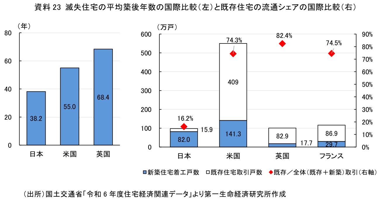エリアによって利用可否に大きな差が生じる要因の一つは、日本の住宅事情にある。日本では、諸外国と比較して住宅が取り壊されるまでの年数が短い(資料23左)。また、住宅の流通量は中古住宅よりも新築住宅の方が多く、新築志向が強い(同右)。近年の住宅価格の高騰により、中古住宅への関心が高まりつつあるが、現状では建物の資産性は低いといえる。こうした背景もあり、リバースモーゲージの担保評価としては、建物ではなく土地の評価が重視されるため、エリアによる利用可否の差が生じやすいと考えられる。この差を縮小するには、建物自体の評価を上げることが一案となる。