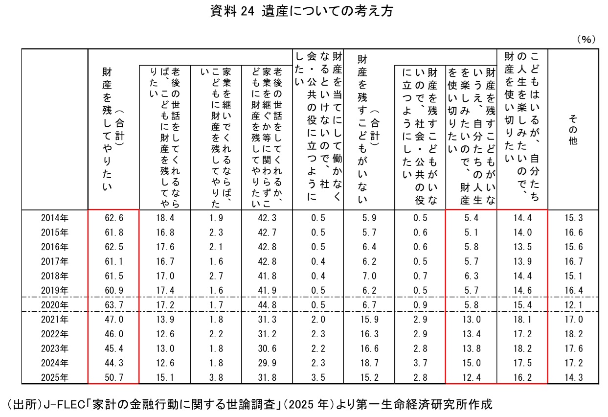 一方で、J-FLECの「家計の金融行動に関する世論調査」によると、「こどもに財産を残してやりたい」と考える人は、2025年調査で増加したものの、長期的には減少傾向にある(資料24)。また、今後少子化が進み生涯無子率が高まると、遺産動機は低下するだろう。さらに、子どもがいても「自分たちの人生を楽しみたいので、財産を使い切りたい」と考える人は、16.2%と少なくない割合を占め、増加傾向にある。「生きているうちに財産を使い切る」ことを推奨した米国の書籍も注目を集めている。リバースモーゲージは、住宅に関する遺産動機が強い人にとっては活用しづらい商品ではあるが、こうした人生を楽しむために財産を使いたいという層にとっては有効な選択肢の一つになりえるだろう。
