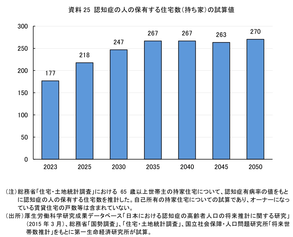 加えて、今後、団塊世代が後期高齢者となり、高齢化が一段と進むと、認知症の人及び認知症の人が保有する不動産の増加が予想される。総務省の「住宅・土地統計調査」と年齢別の認知症有病率をもとに、認知症の人の保有する住宅の数を推計したところ、2023年時点で177万戸、2025年時点で218万戸との結果が得られた(資料25)。また国立社会保障・人口問題研究所の将来世帯数推計をベースにすると、2040年時点では267万戸と、今後も高齢化の進展とともに認知症の人の保有する住宅の増加が見込まれる。