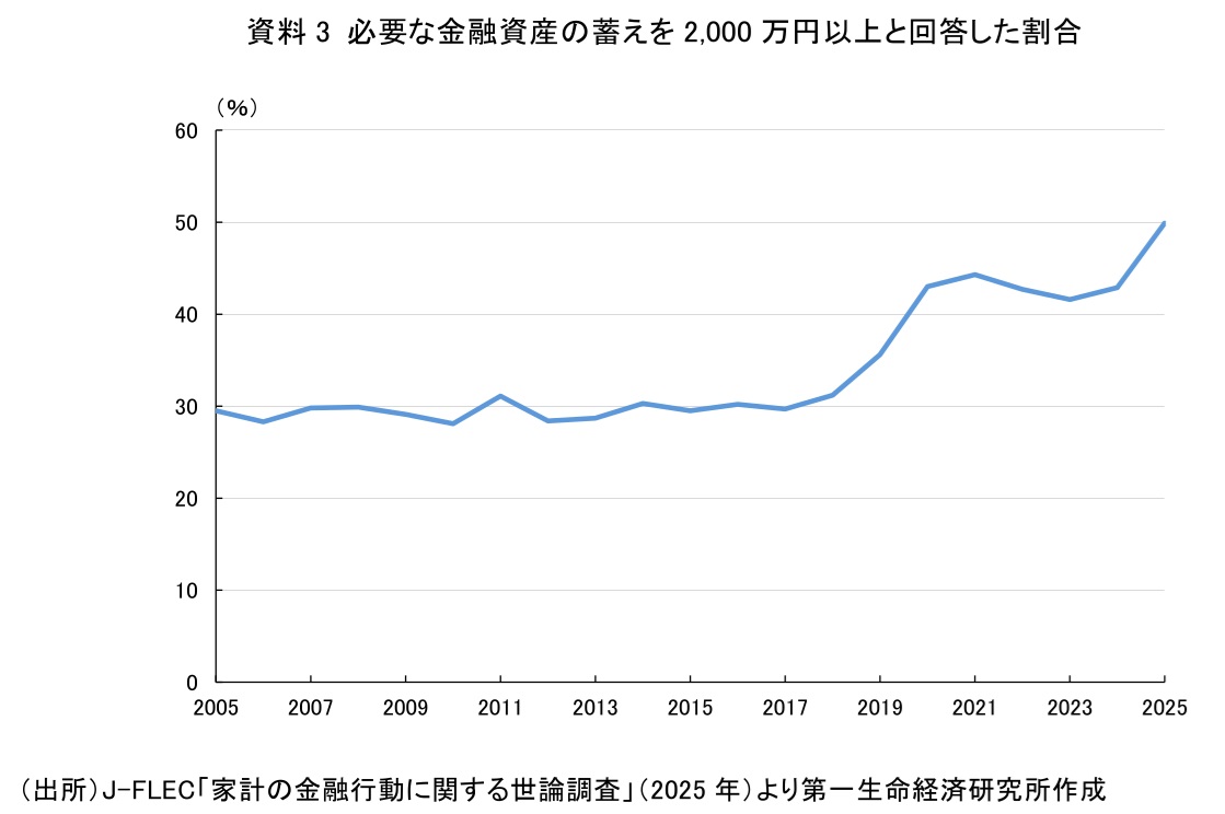 高齢化の進行、長寿化が進む中で老後のための蓄財の意識が高まっているとみられる。こうした流れの一つの契機となったのは、いわゆる「老後2,000万円問題」だったと考えられる。金融庁のワーキング・グループが発表した報告書案において、高齢夫婦世帯が平均寿命まで生きた場合に年金収入だけでは生活費が約2,000万円不足する、という試算が話題を呼び、老後の資産形成の重要性が認識される大きなきっかけになった。実際に、金融経済教育推進機構(J-FLEC)の「家計の金融行動に関する世論調査」では、金融資産の目標残高を2,000万円以上とする割合が2018年:31.2%→2019年:35.6%→2020年:43.0%と急上昇、足元ではさらに上昇しており、2025年:49.9%に達している(資料3)。