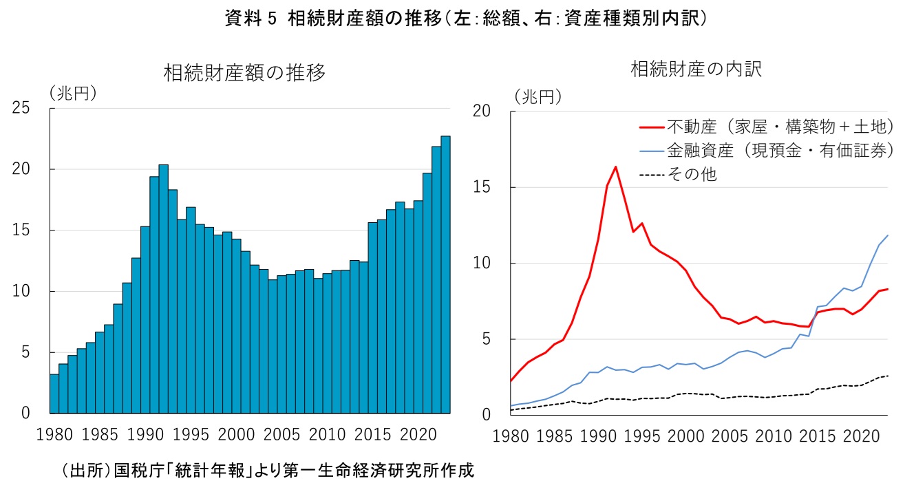 将来不安を抱える高齢者世帯であるが、平均的にはストックリッチの傾向がある。総務省統計に基づけば、85歳以上でも1,500万円を上回る(2019年時点、総務省「全国家計構造調査」、資料4)。60-64歳をピークに85歳以上の年齢階層にかけて平均資産額が少なくなる傾向がみられる。ただ、それでも平均資産額の水準は50代後半の平均と同等であり、多くの人が多額の金融資産を残した状態で亡くなっていることが示唆される。実際に税務統計をみても、直近値の2023年の相続財産(相続税における相続人の取得財産価額)は22.7兆円と年々増加している(資料5)。株価の上昇などを背景に金融資産の増加が目立つ状況であるほか、地価の上昇が定着しつつあることで不動産も増加傾向にある。