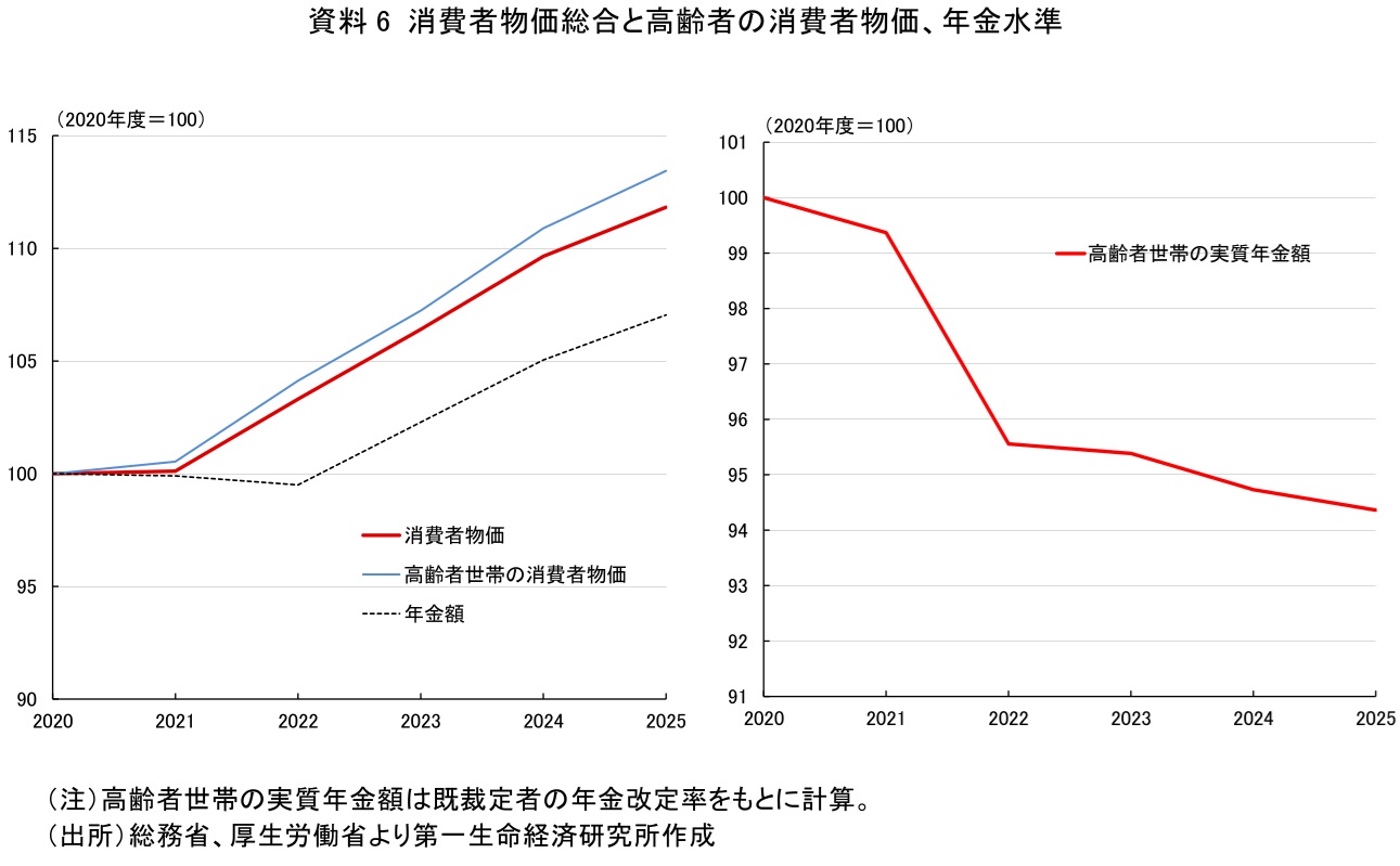 また、年金収入は物価上昇率(消費者物価の総合指数)によって毎年改定が行われ、インフレにフォローする仕組みになっている。一方で、高齢者世帯はほかの世帯に比べて消費に占める必需品支出の割合が高い。昨今のインフレは食料品主導で進んでいることに特徴がある。品目ウェイトを高齢者の消費に合わせて物価を再集計すると、消費者物価総合指数よりも高くなる。この点で物価調整自体も高齢者の生活水準を完全に維持する形にはなっていない。計算した高齢者の物価指数と年金改定率を用いて、既裁定者の実質年金水準を計算すると、2020年度から5%強程度の実質目減りが進んでいる計算になる(資料6)。