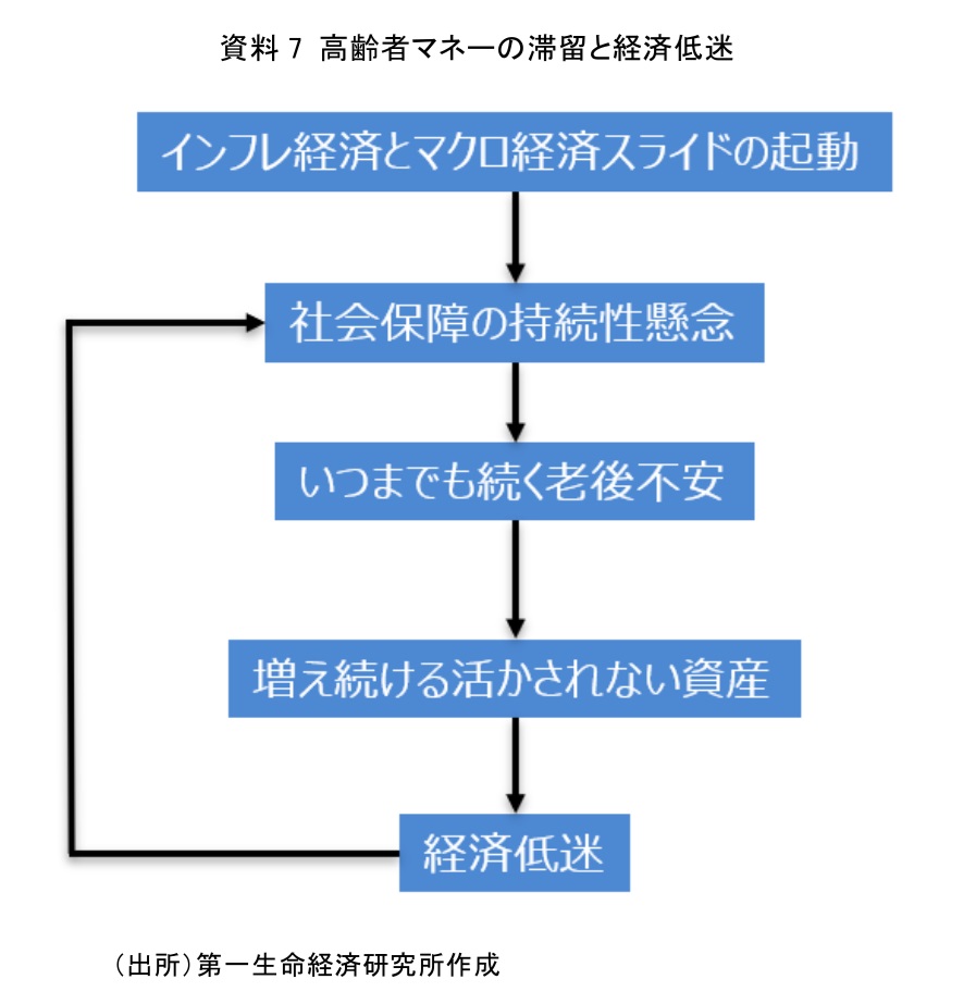 インフレ経済とマクロ経済スライドの本格発動、それに伴う社会保障の持続性懸念、長寿化に伴って、「高齢者になっても続く老後不安」が生じている(資料7)。このため、資産を取り崩さないことが合理的な選択となり、活かされない資産が増加、高齢者消費の足かせとなっている。経済の低迷は更なる社会保障の持続性懸念にもつながることになる。経済の主たるプレイヤーとなりつつある高齢者消費の低迷を少しでも抑止することが、今後の日本経済を論じるうえで重要性を増している。