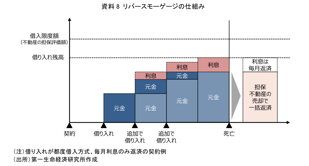 リバースモーゲージとは、高齢者が所有する不動産を担保として金融機関等から融資を受ける金融商品の一種である。一般的な住宅ローンと異なる最大の特徴は、返済の仕組みにある。通常の住宅ローンでは、まとまった金額を一括で借り入れた後、毎月元金と利息を返済していき、借入金を完済すると自宅に対する担保権が解除される。リバースモーゲージでは、不動産の評価額をもとに算出した融資限度額の範囲内で借り入れを行うが、返済は、生前は基本的に利息のみの支払いであり(利息も元金に繰り入れて、生前は全く支払いが発生しないケースもある)、担保に入れた不動産を死亡時に売却することで借入残高を一括返済する仕組みになっている。借入残高の変化に着目すると、通常の住宅ローンは返済が進むことで徐々に借入残高が減少していくのに対し、リバースモーゲージは死亡時の一括返済を前提として、(限度額を上限として)融資を受けるたびに借入残高が増加する「逆の動き」になることから、「リバース」と呼ばれている(資料8)。