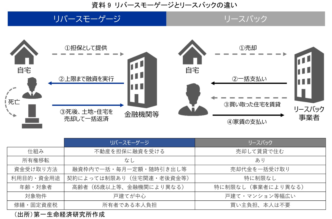 また、リバースモーゲージによく似た金融商品にリースバックがある。不動産をキャッシュに転換するという点は同じだが、リースバックは不動産を売却するため、所有権が手元を離れる点が大きく異なる。リースバックの場合は、自宅を売却後、賃貸として借り受け、毎月家賃を支払うことで、住宅に住み続けることになる(資料9)。