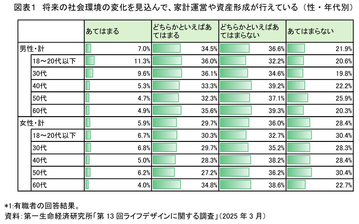 今回の調査の結果、家計運営の現状に対する評価について、「将来の社会環境の変化を見込んで、家計運営や資産形成が行えている」との設問に「あてはまる」と「どちらかといえばあてはまる」と答えた男性の合計割合は41.5%、「あてはまらない」と「どちらかといえばあてはまらない」と答えた男性の合計割合は58.5%であった(図表1)。女性では前者が35.6%、後者が64.4%となっている。