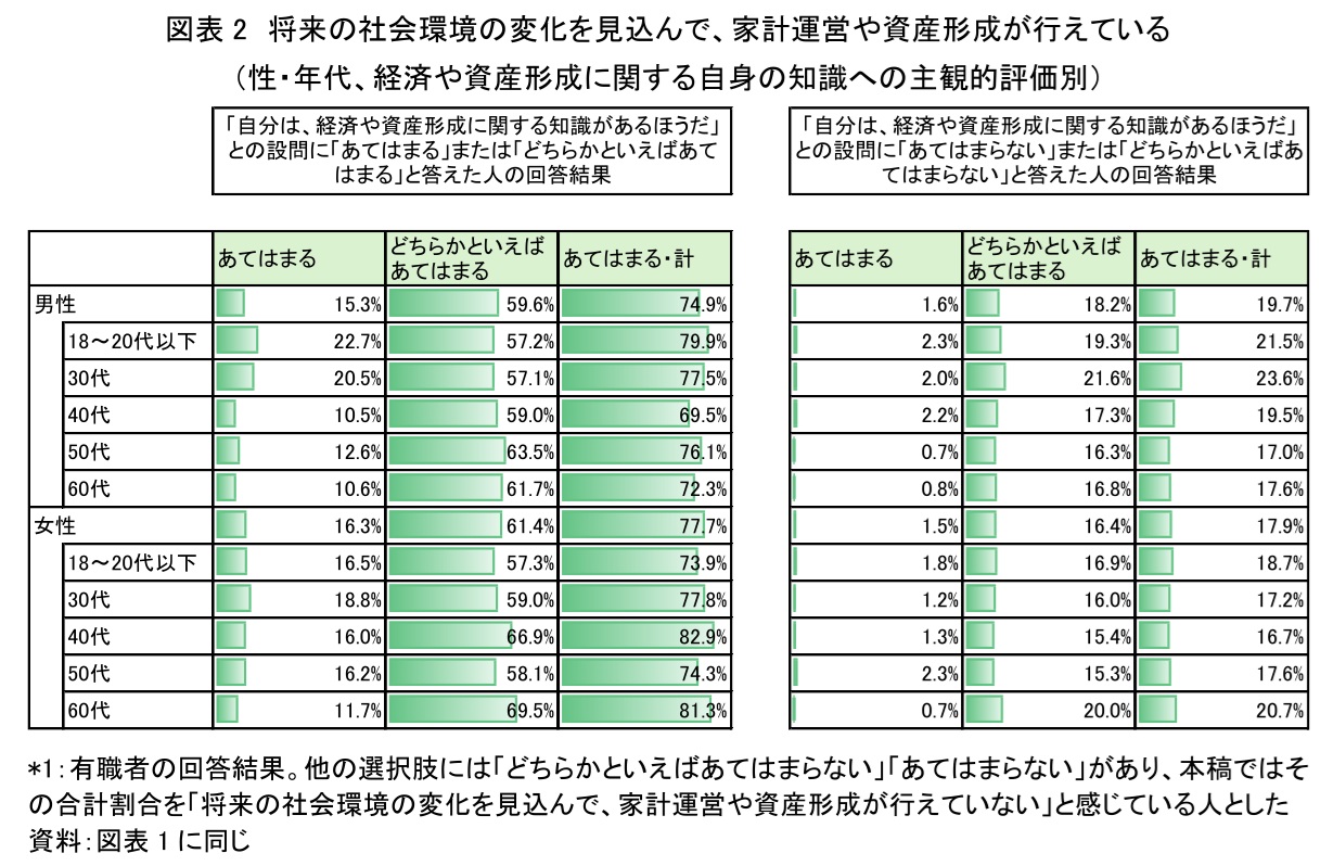 このような評価には、経済や資産形成に関する自身の知識に対する主観的な評価が関連しており、自身の知識に対する評価が高い人のほうが、家計運営や資産形成の現状に対する評価も高い傾向にある(図表2)。図表のように、「自分は、経済や資産形成に関する知識があるほうだ」と答えた人(「あてはまる」または「どちらかといえばあてはまる」と答えた人、以下同じ)では「将来の社会環境の変化を見込んで、家計運営や資産形成が行えている」と感じている人(「あてはまる」「どちらかといえばあてはまる」の合計割合、以下同じ)がどの年代でも圧倒的に多く、7~8割前後を占める。これに対して、「自分は、経済や資産形成に関する知識があるほうではない」と答えた人(「自分は、経済や資産形成に関する知識があるほうだ」との設問に「あてはまらない」または「どちらかといえばあてはまらない」と答えた人、以下同じ)では、「将来の社会環境の変化を見込んで、家計運営や資産形成が行えている」と感じている人が2割前後にとどまっている。