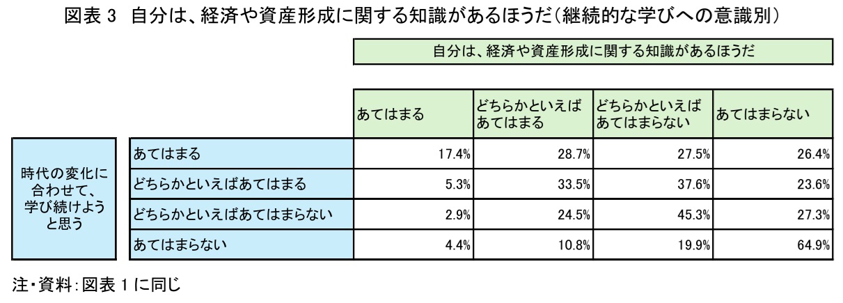 そして、経済や資産形成に関する自身の知識への評価には、継続的に学ぶことに対する主体的な意識との関連性もみられる(図表3)。図表のように、「時代の変化に合わせて、学び続けようと思う」との設問に「あてはまる」「どちらかといえばあてはまる」と答えた人のほうが、自身の知識に対する自己評価は高い傾向にある。