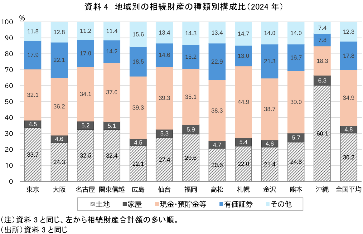もっとも、沖縄管内では資料4でみたように、相続財産に占める土地の割合が約6割と、他地域と比べてかなり高い。すなわち、課税対象となる被相続人は、主として観光地や都市部といった評価額の高い土地を多く保有する層に集中する構造にある。言い換えれば、沖縄管内の1人当たり指標が高いのは、課税対象の裾野の広さを意味するものではなく、むしろ裾野の狭さの裏返しと考えられる。これに対し、東京管内の相続財産は、地価の高い自宅等の不動産のほか、現金・預貯金等や有価証券といった金融資産の双方が厚く、かつ課税割合の高さから課税対象の裾野が広いことが特徴である。つまり、中間層の住宅保有層まで相続税の影響が及ぶ都市型構造を形成していると考えられる。